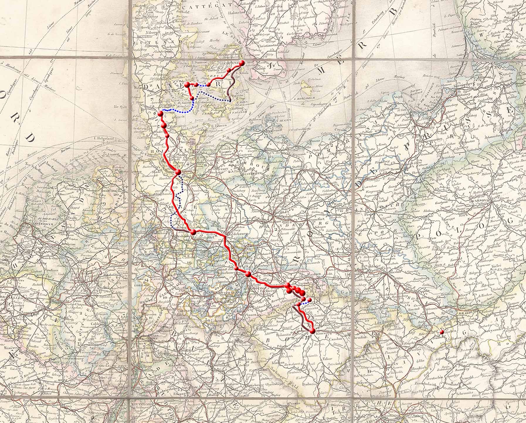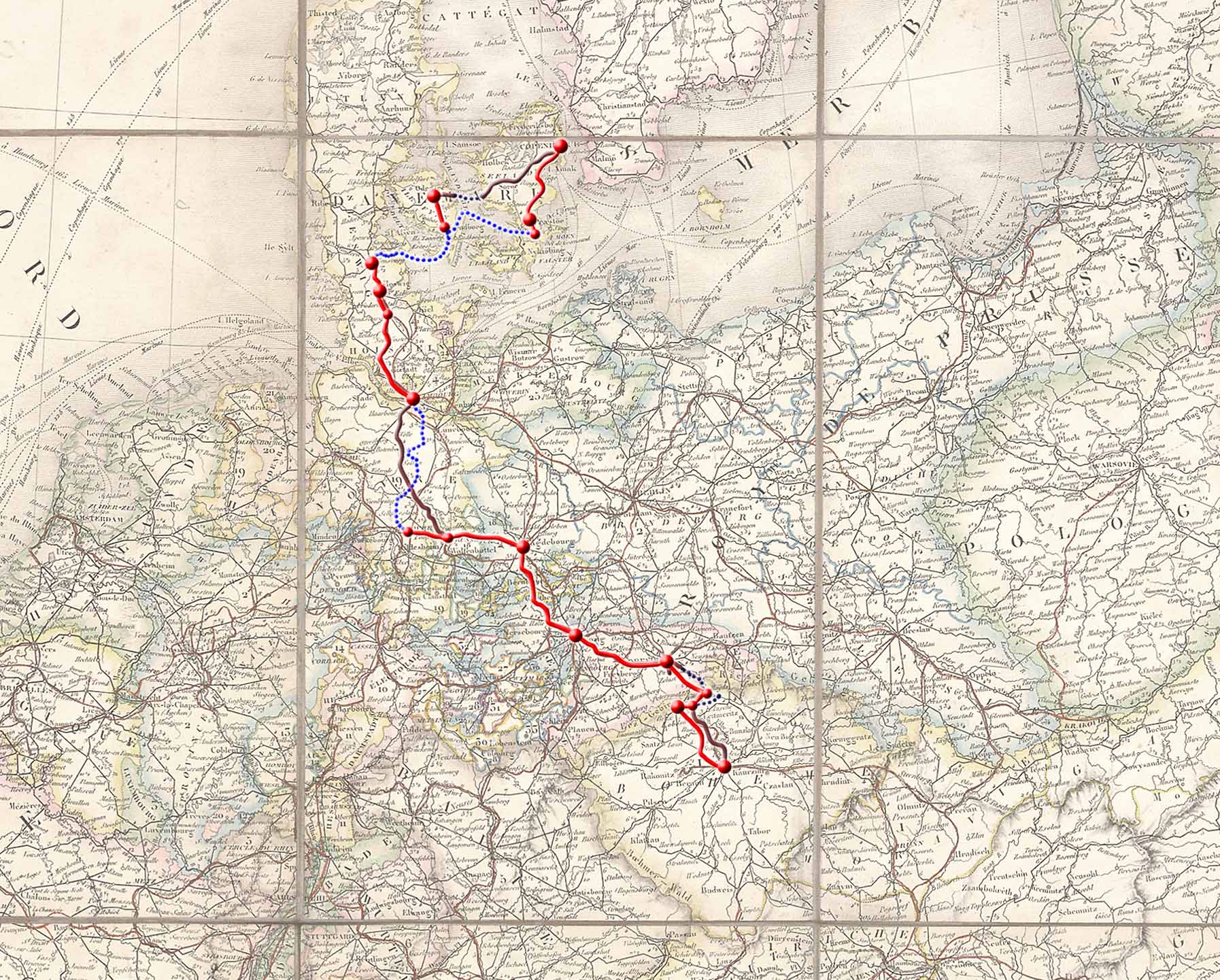 | 2 | Passing through | Celle | Celle | Celle | 1833-04-28 | 1833-04-28 | 🐎 Postvogn | 52.624056,10.081052 |