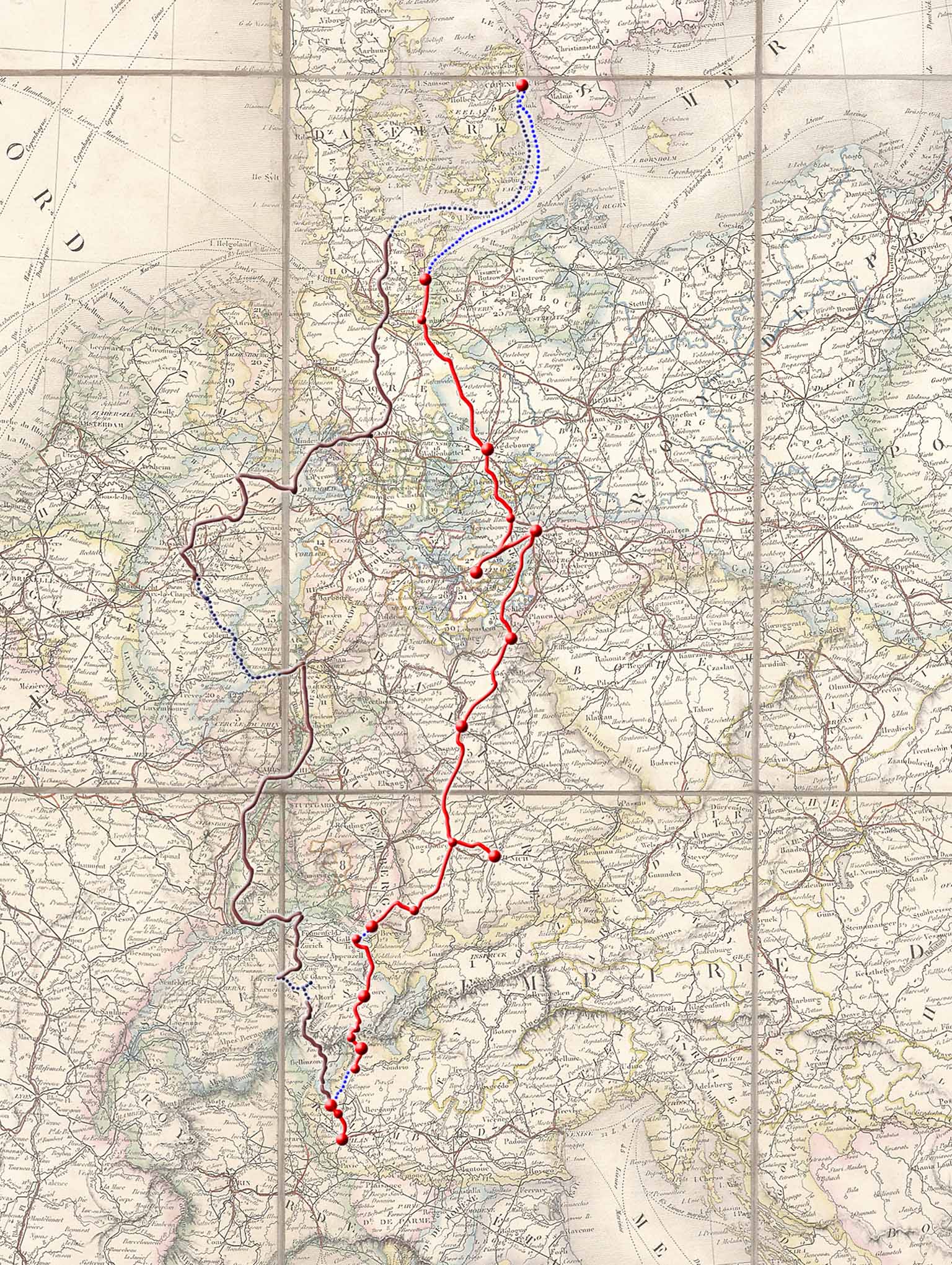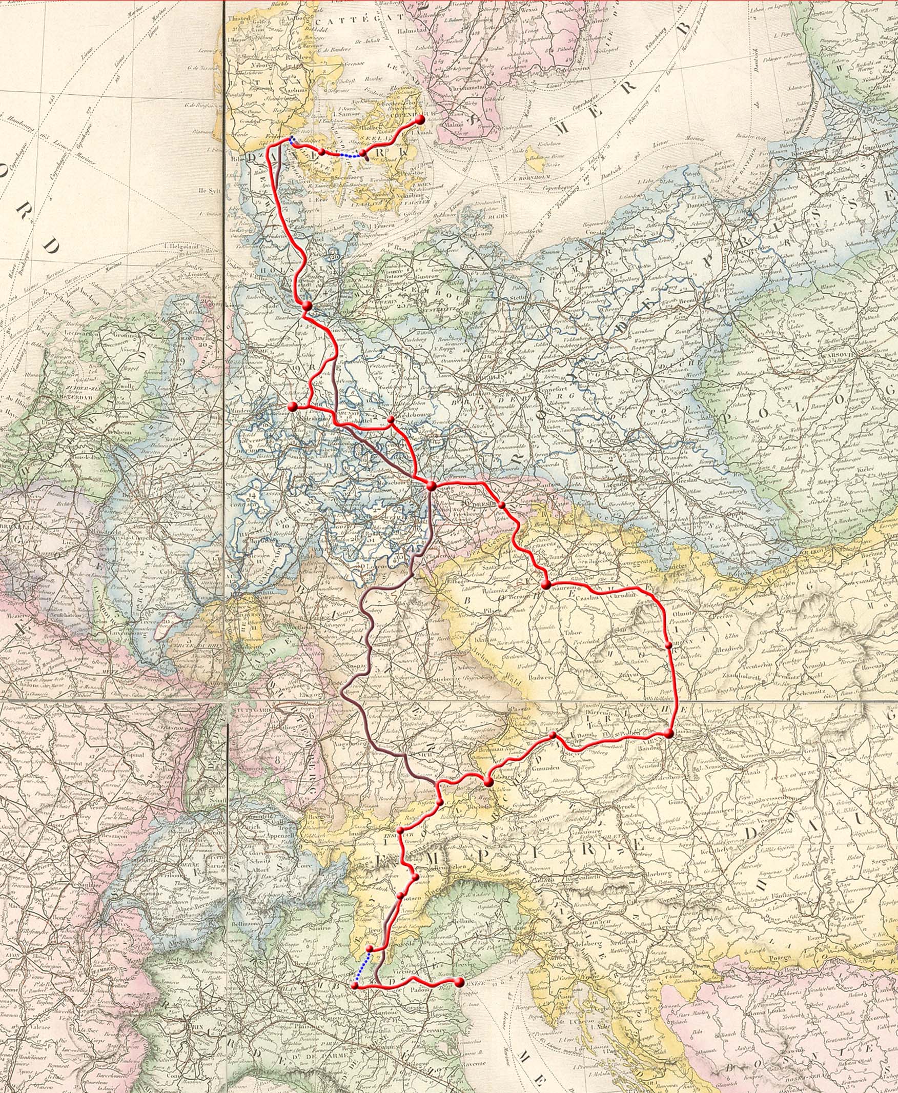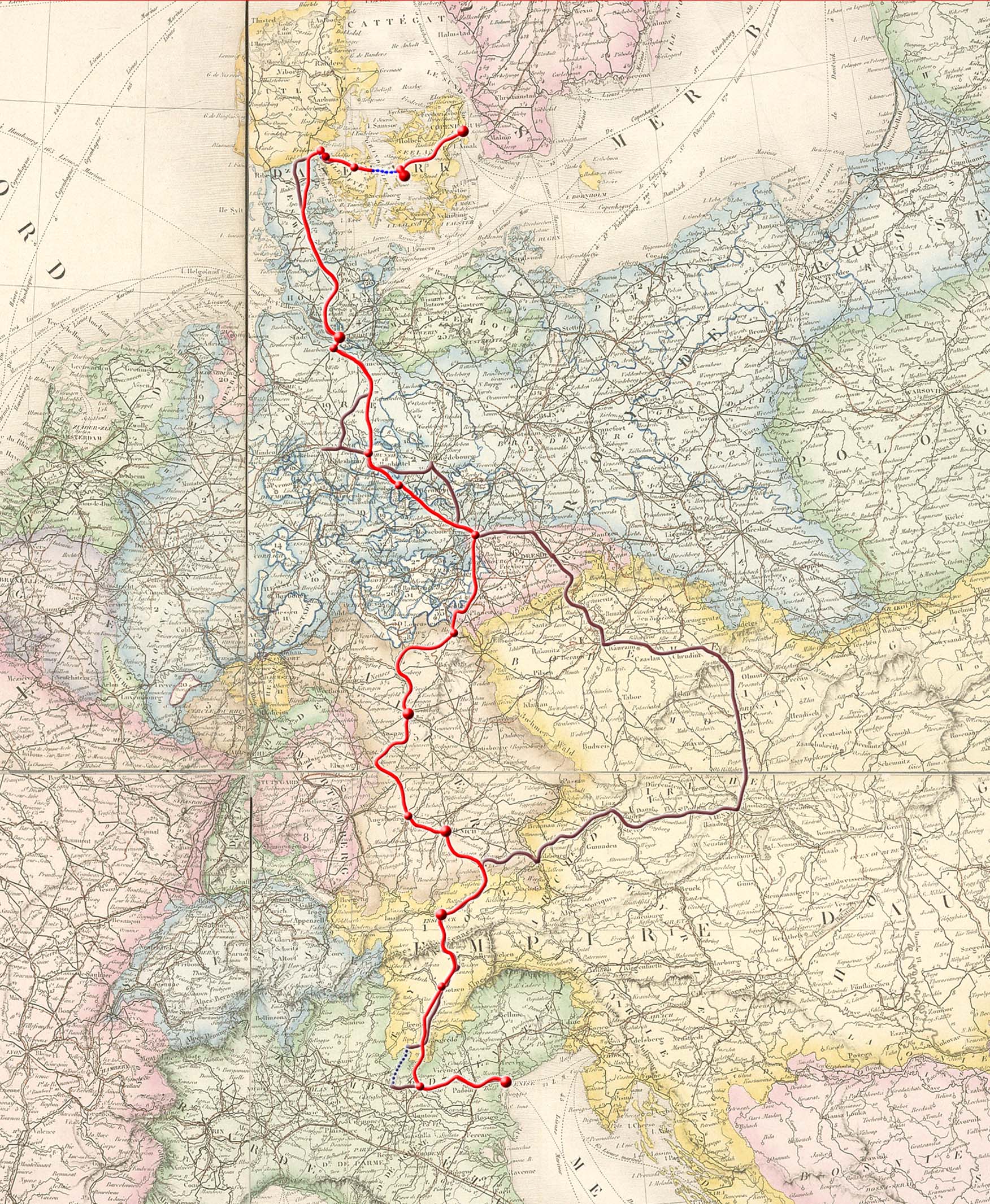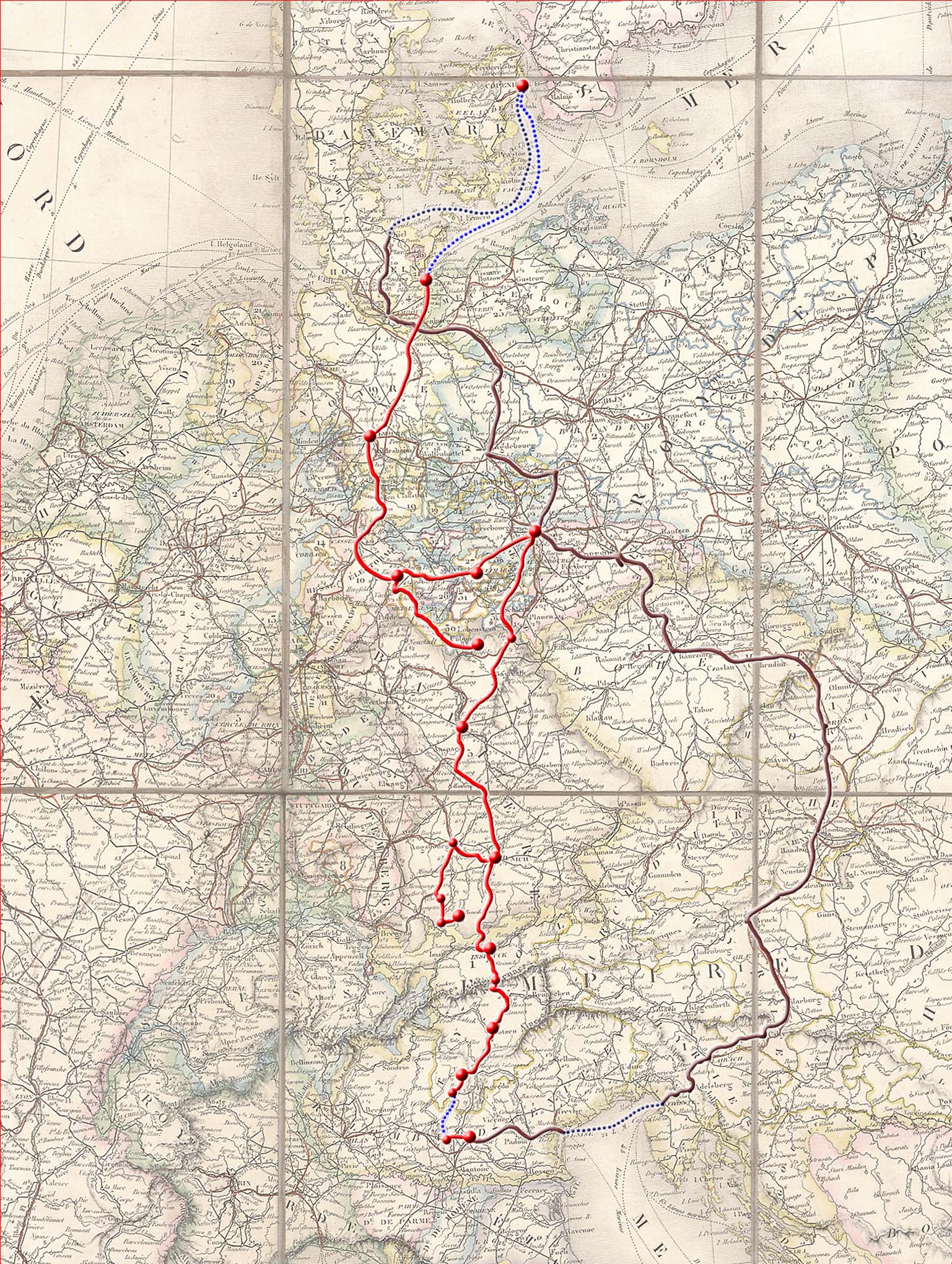 Rejse 2, 1833-1834Afgang: 22. april 1833Hjemkomst: 3. august 1834 Lande: Tyskland, Frankrig, Schweiz, Italien, Østrig(-Ungarn) Samlet udgift: Rejsestipendium bevilget 13.marts, i alt 1400 rdl. |