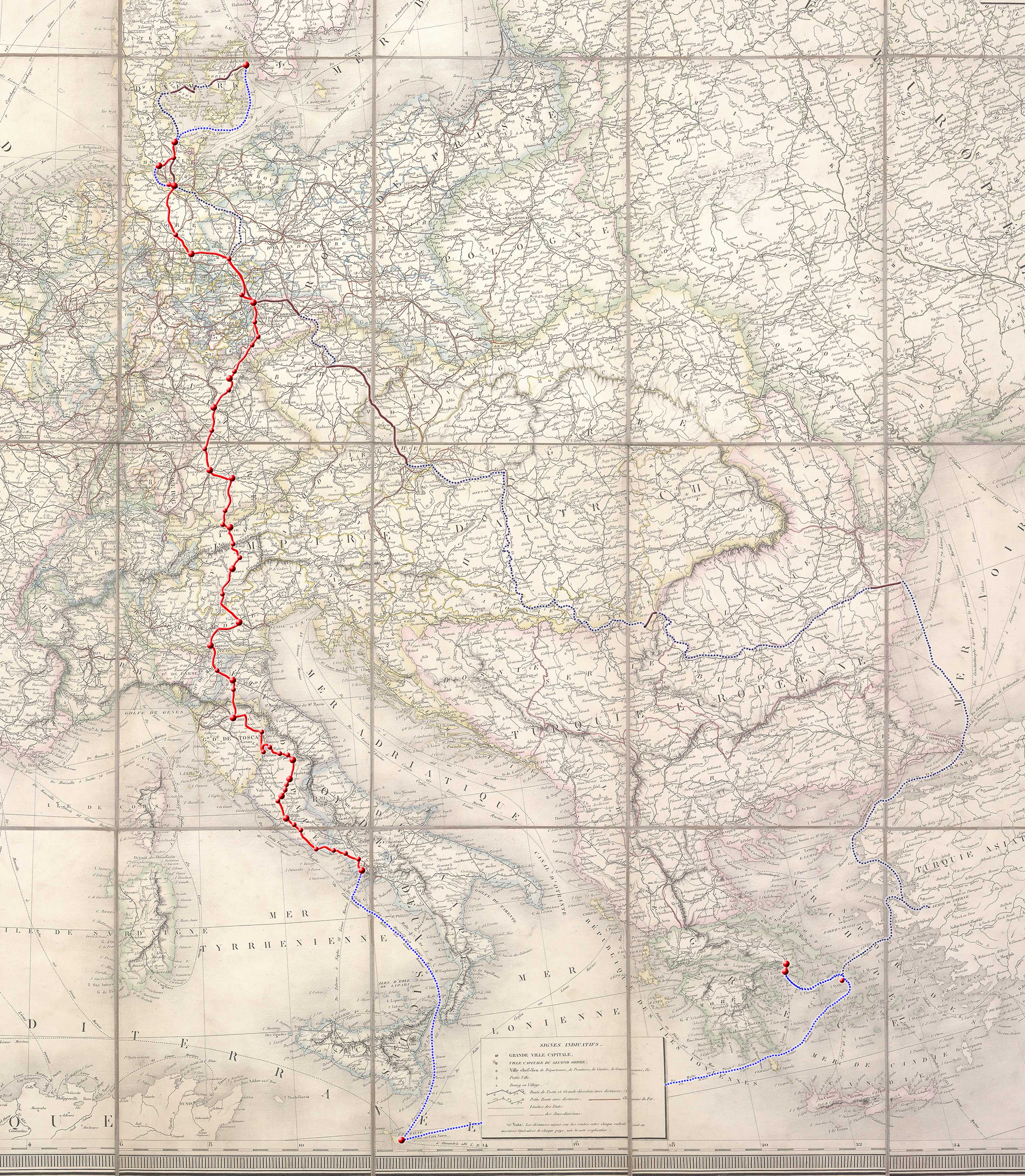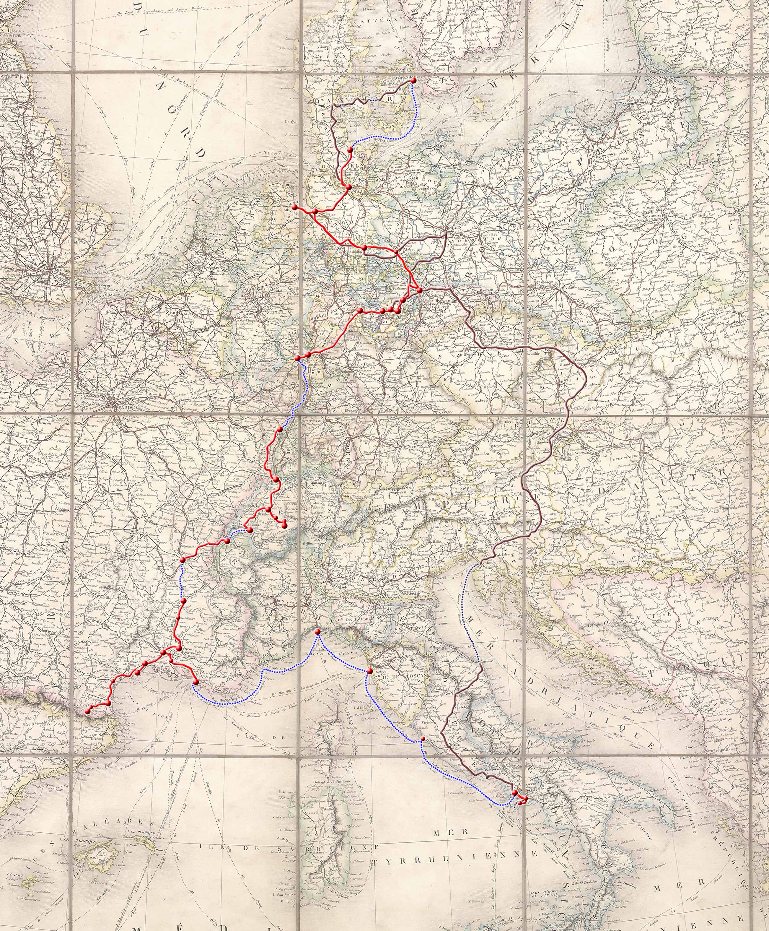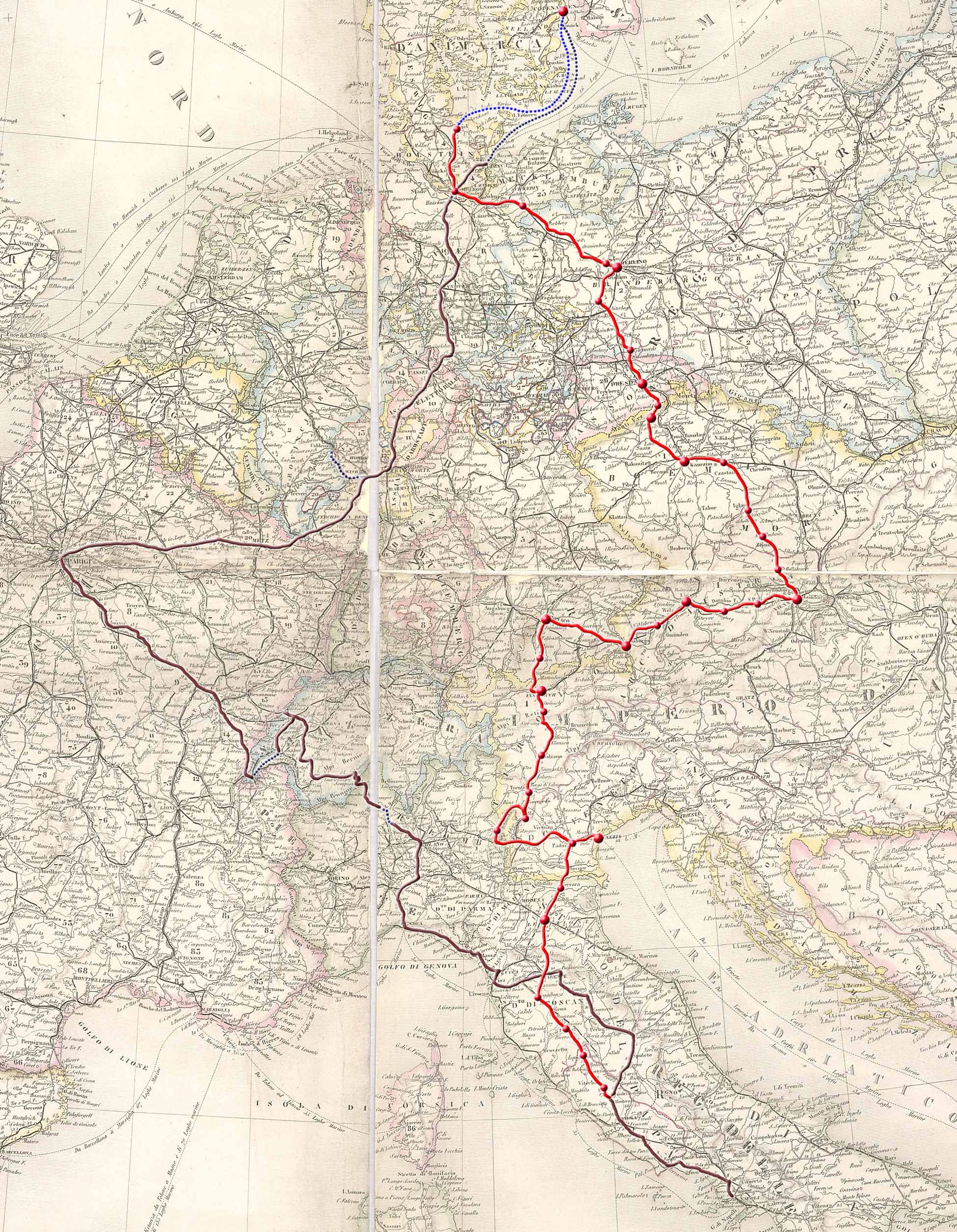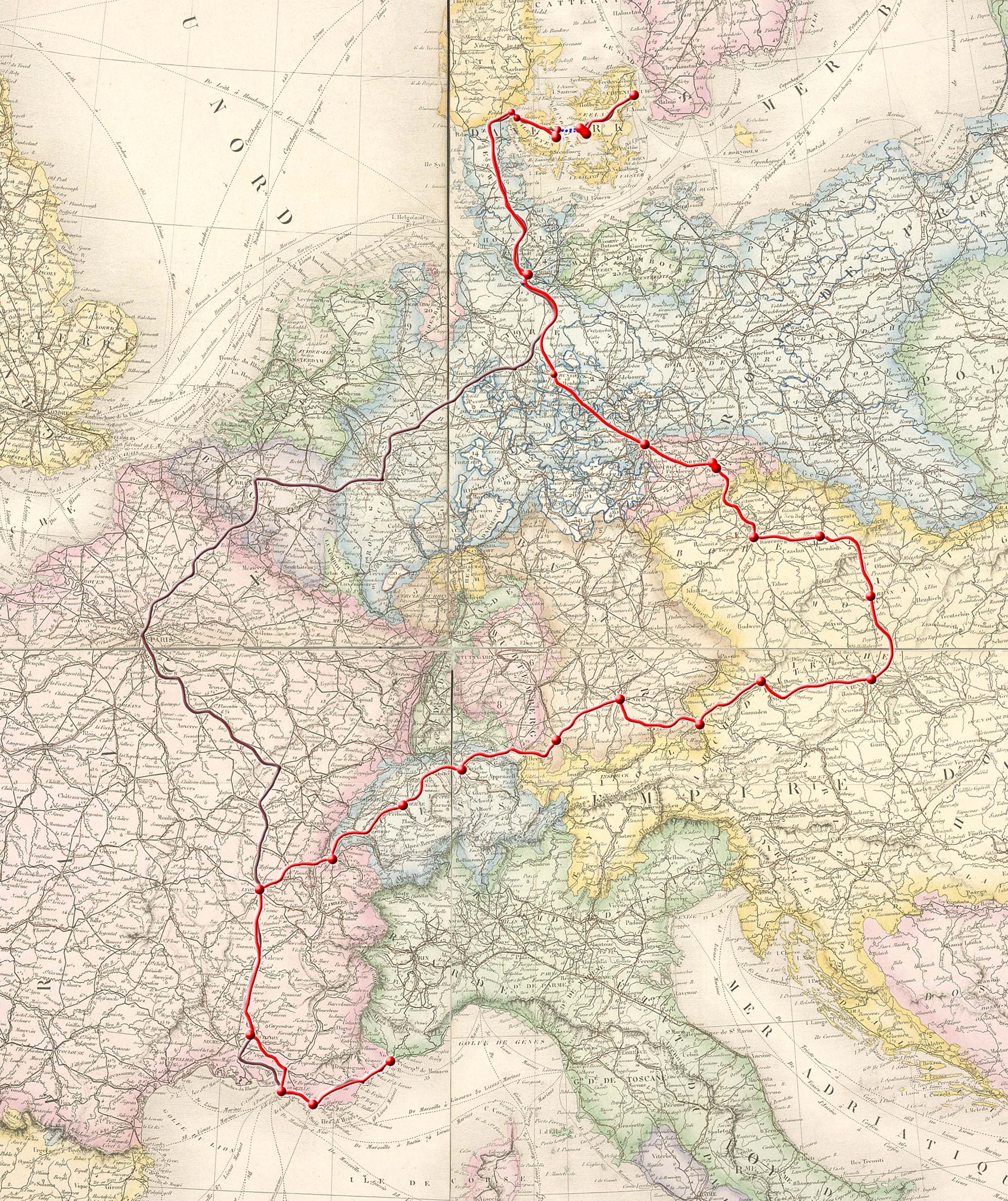 Rejse 2, 1833-1834Afgang: 22. april 1833Hjemkomst: 3. august 1834 Lande: Tyskland, Frankrig, Schweiz, Italien, Østrig(-Ungarn) Samlet udgift: Rejsestipendium bevilget 13.marts, i alt 1400 rdl. |