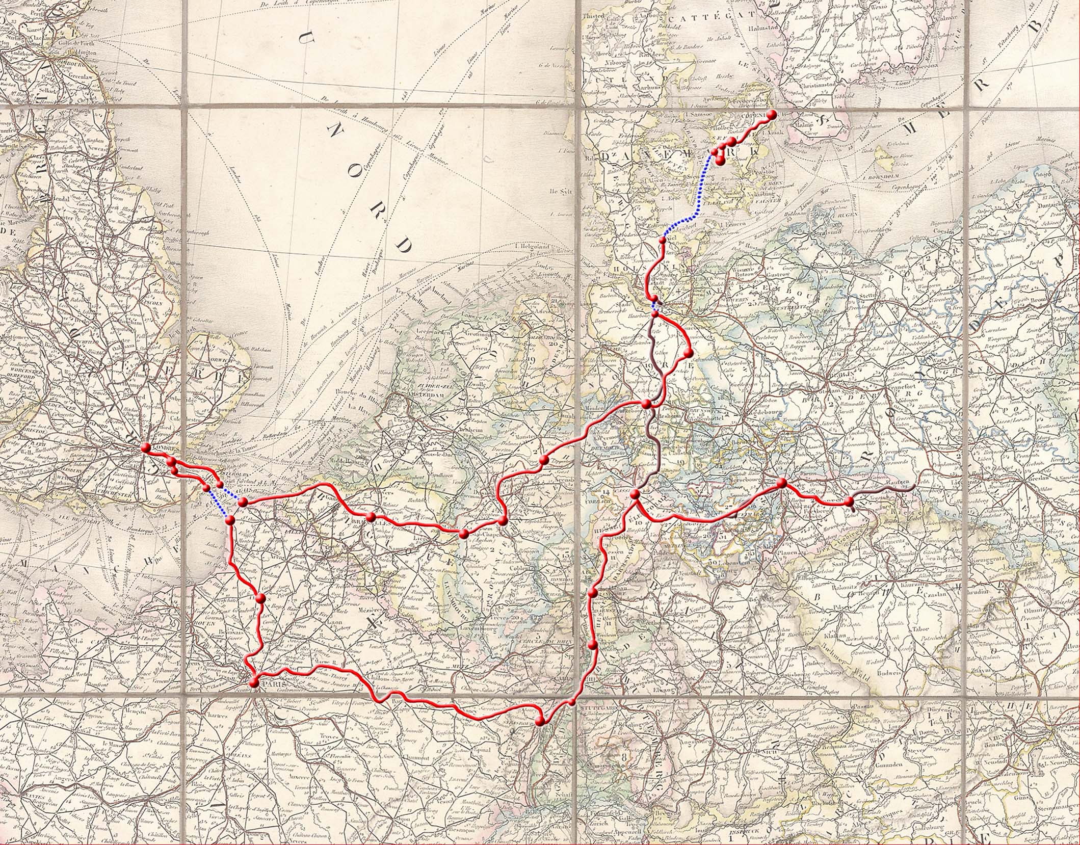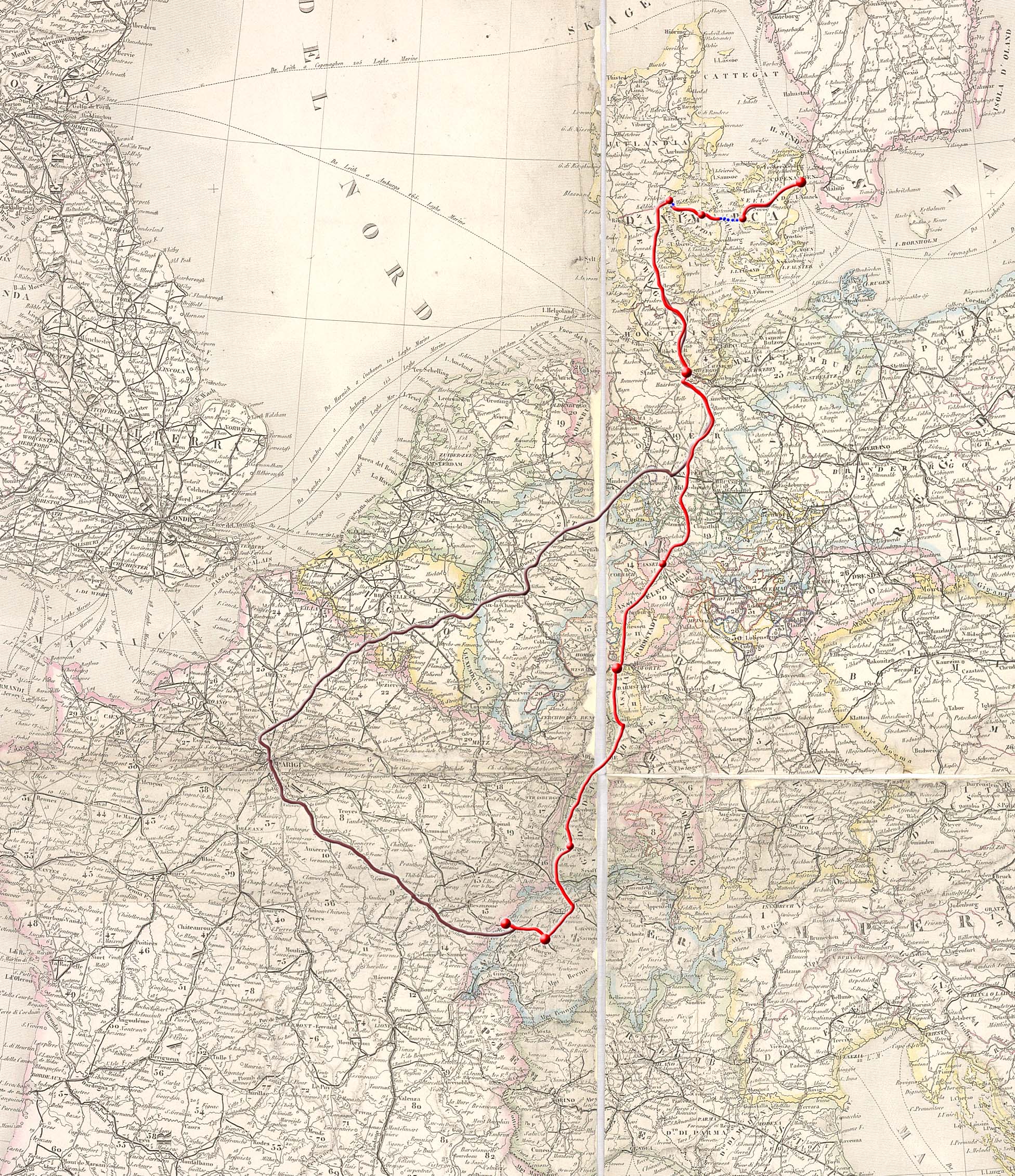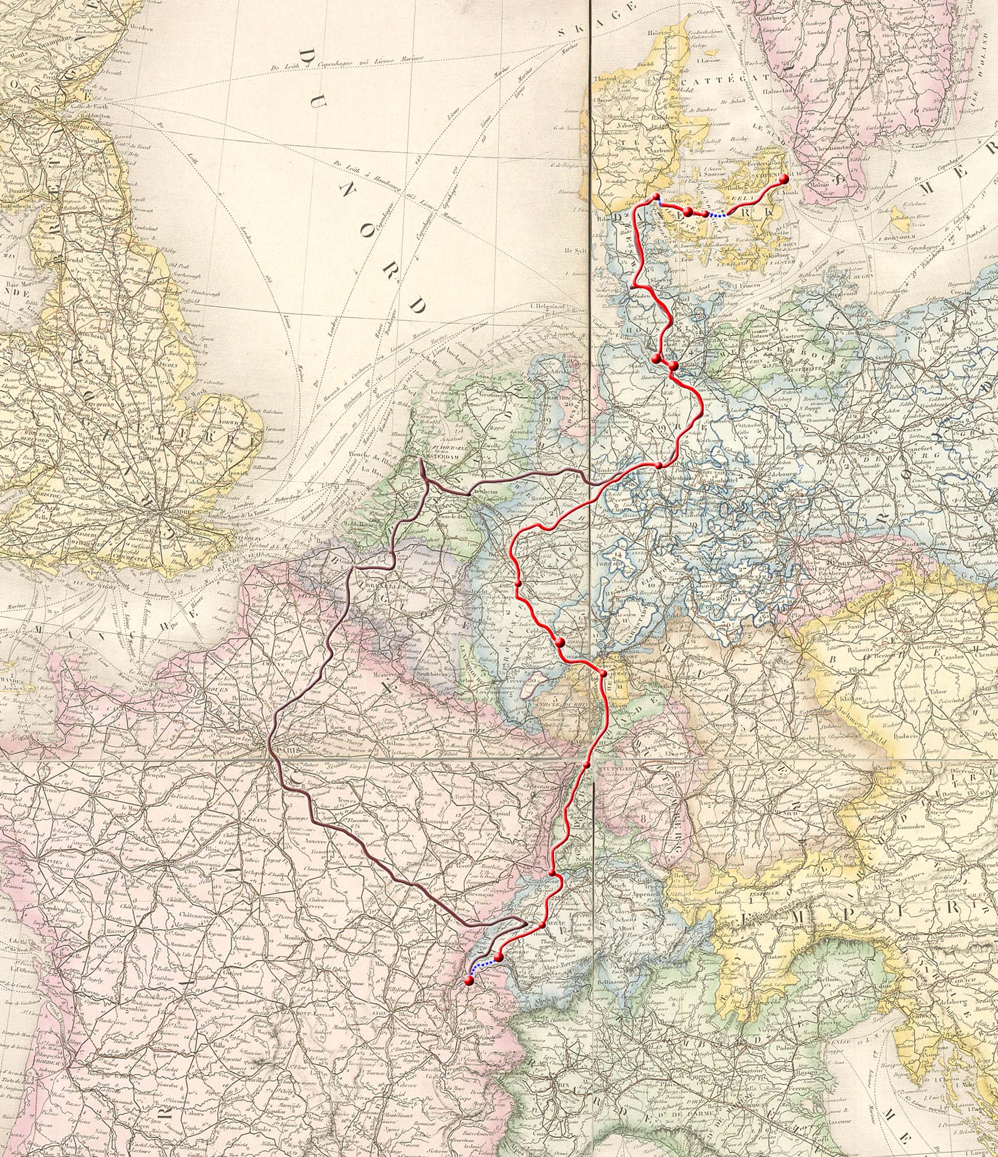 Rejse 1, 1831Afgang: 16. maj 1831Hjemkomst: 24. juni 1831 Beskrivelse: Flugt fra forelskelsen i Riborg Voigt Lande: Tyskland Samlet udgift: 75-85 speciedaler = 150-170 rdl. |
